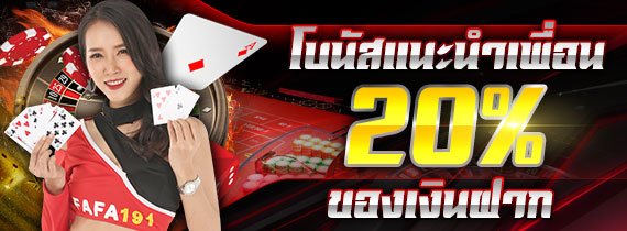 - คืนยอดเสียบาคาร่า 20% เมื่อมียอดเสีย 10,000 บาทได้รับคืนยอดเสีย 2,000 บาท